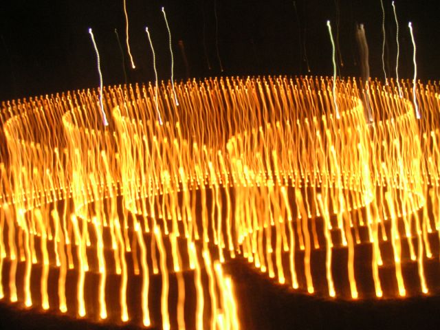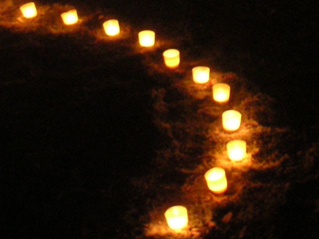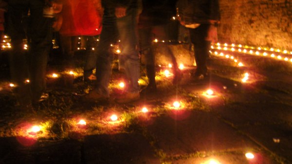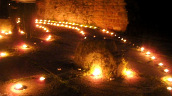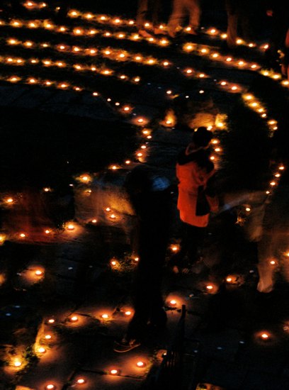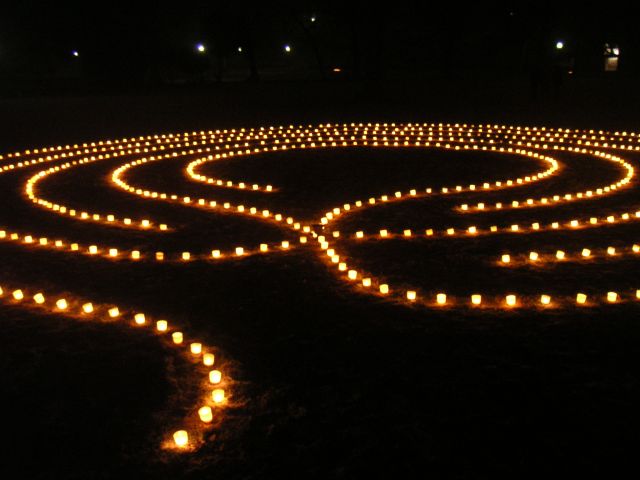 Wir stellen innerlich auf das Schreiten im Labyrinth ein. Das Begehen in einer bestimmten einfachen Schrittfolge findet zuerst in Stille statt. Dann stimmen wir beim Schreiten ein Lied an (z.B das Spiral-Lied von Arunga Heiden). Dann geht jeder wieder für sich in meditativer Weise die Bahnen des zwischen den Kerzen entlang. In der Mitte angekommen gibt es einen Moment des Innehaltens. Man lässt die Energie der vielen Lichter auf sich wirken und empfindet sich selbst in der Mitte der Kreise und von sich Selbst. Je nach dem spiele ich Didgeridoo, singe ein Mantra und wir stimmen etwas gemeinsam an. Das Herausgehen ist ebenso ein Schreiten. Zum Ende stehen wir außen um das Labyrinth- es gibt wieder klangliche Elemente zum Abschluss. Die Form des Labyrinthes war oft die des Fünfstern-Labyrinthes, welches auf Gabriela Shinkara, ihren Lebenpartner und die Fünfstern-Praxis zurückgeht. Beim letzten Mal (Juli 2010) haben wir eine Spirale ausgelegt. Lasse Dich durch die Fotos (s.u.) in die Stimmung des Lichterlabrinthes hineintragen!